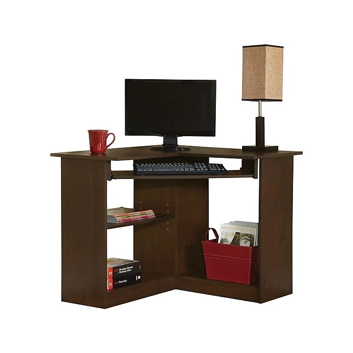 Upgrade a home or office corner with this V-shaped computer desk in laminated resort cherry finish. The two open shelves accommodate books and file folders, and the adjustable shelf offers a customizable space for work essentials. The sturdy tabletop of this Easy 2 Go computer desk provides neat organization for a desktop system, and the space-saving pull-out tray easily fits a keyboard.