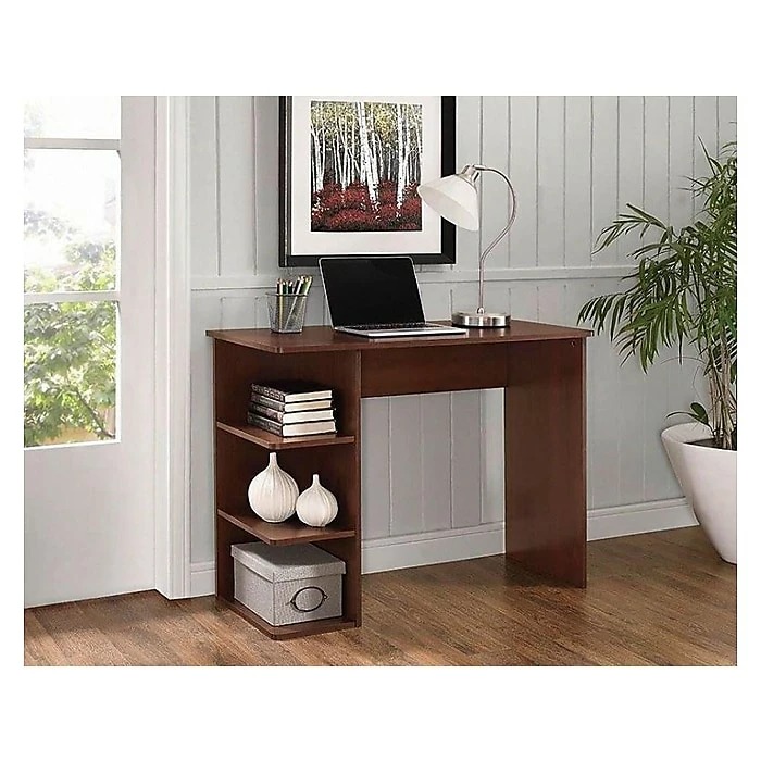 Make the most of a small office space with this student desk. The compact footprint fits neatly in a corner or spare room, while the simple design coordinates effortlessly with a wide range of decor themes. This desk boasts a built-in three-shelf bookcase, providing handy storage for binders, notebooks and other essentials. An open design underneath offers ample legroom, so you can stretch out comfortably while you work on your latest project or report. A spacious work surface gives you plenty of room for a laptop, desk organizer and computer peripherals, and the durable laminate construction resists scratches, stains and spills for long-lasting use. This desk comes ready to assemble for quick, hassle-free setup. Featuring a classic brown wood finish and clean lines, this Easy2Go student desk combines traditional good looks with a hint of modern style.