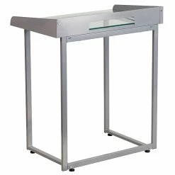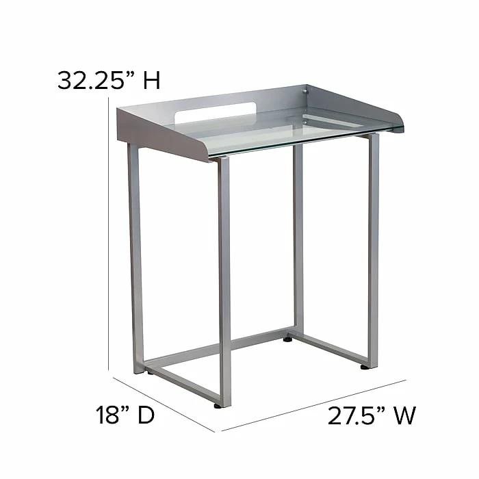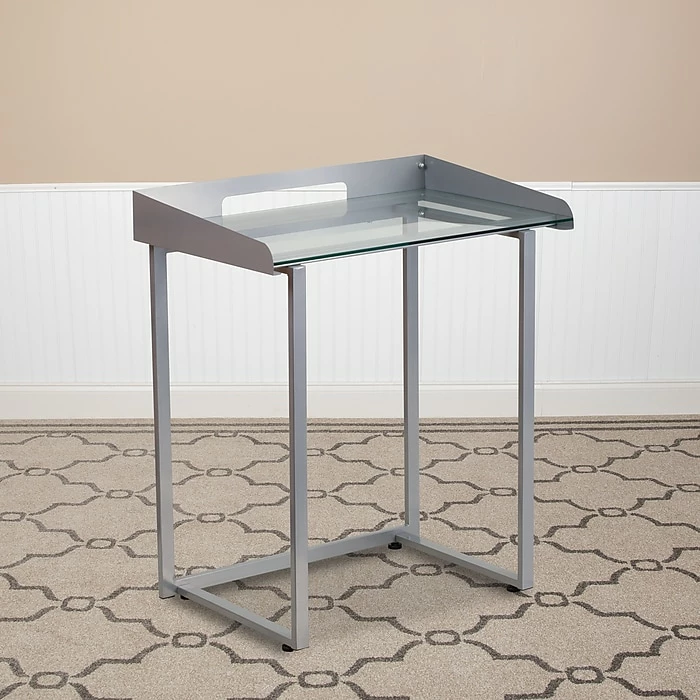 This simple designed glass desk attracts the buyer who needs something simple yet modern. The raised rim will prevent papers from easily falling off the edge of the table. The cutout back allows for easy wire management. The compact sized desk is perfec t for small spaces when the desk is to be used for writing, studying and laptop usage.