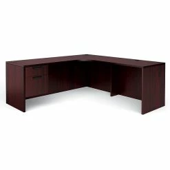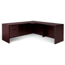 Maximize office space with the Global Superior Corner Workstation. Designed to fit into the corner of the room, this computer workstation desk is made with commercial grade laminate for long-lasting use. An American mahogany finish with matching PVC edg ing adds an attractive, polished look to any workspace. Keep files and supplies organized with the credenza, return shell, and box/file pedestal.