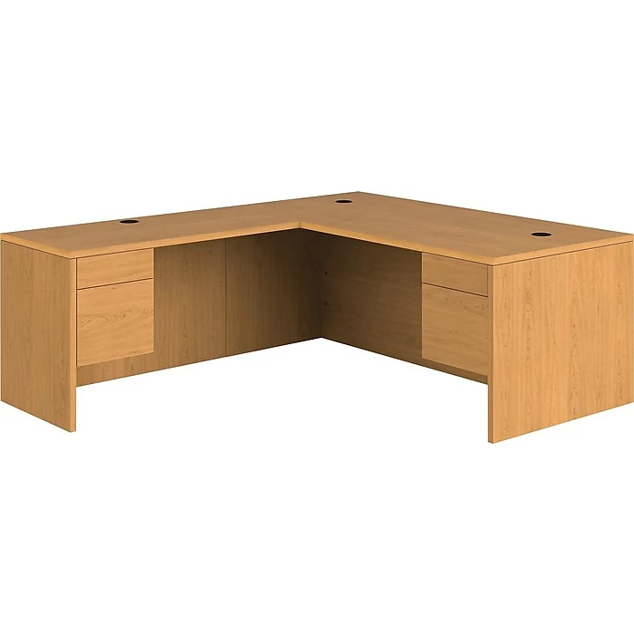 Create a spacious area to get your important work done with this HON 10500 Series L-shaped office desk. The multi-ply laminate surface withstands scratches, scuffs, and spills, and inner-frame construction delivers strength and durability for everyday use. A metal-to-metal fastener system keeps each component securely attached, providing a precise fit. This desk features thoughtfully situated cable management systems, keeping wires and cords from phones, computers, and printers hidden from sight. The built-in modesty panel lets you stash bags, shoes, and other personal items while keeping them out of view, while the generous dimensions afford ample space for your computer setup, reference books, and other office essentials. With two locking file drawers, this L-shaped desk puts critical documents and forms within arm reach. Two locking box drawers offer room for office supplies while also keeping your wallet and smartphone securely tucked away. The natural wood finish brings a bright, inviting look that makes this HON 10500 Series L-shaped office desk an ideal option for reception areas as well as executive offices.