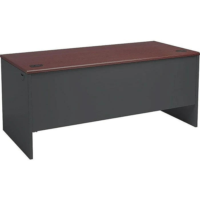 Give your office or cubicle a modern look with this HON 38000 Series left-pedestal desk in mahogany and charcoal. The high-pressure laminate top stands up to coffee spills, scratches and dings, and a waterfall edge provides added comfort for long days spent typing emails and reports. Durable steel construction makes this desk ideal for busy offices, giving you a durable, long-lasting workstation. With Tru-Fit fronts, each drawer closes with precision for a clean, professional appearance. A wire management system keeps cords and cables under control, preventing tangles and messes behind your office electronics. The spacious work surface accommodates a CPU tower, monitor, phone and other desk essentials, and the open design underneath offers ample legroom for stretching in between tasks. Use the file drawer to sort forms, reports and client documents, and put the box drawer to work as your office supply storage space. With a built-in modesty panel, this HON 38000 Series left-pedestal desk keeps bags and briefcases neatly out of sight.