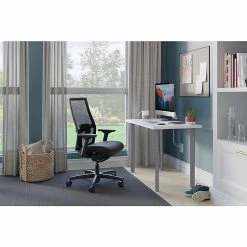 Stay as productive in your own digs as you do in the office with this great table desk and task chair setup that lets you get down to business in no time. Keeping things nice and easy, the HON Coze table desk components offer simple and quick assembly to give you clean, contemporary style plus plenty of function in a matter of minutes. The look is modern and fresh, sized perfectly for compact spaces. And when you’re ready to dive into work, you’ll mesh perfectly with this HON Ignition 2.0 task chair that delivers ergonomic comfort that just gets you. Adjustable everything lets you work your way, while a breathable back flexes with your every move. Because we all know that the best ideas happen when you really stretch yourself. Laminate and edgeband are designer white. Chair mesh is black.