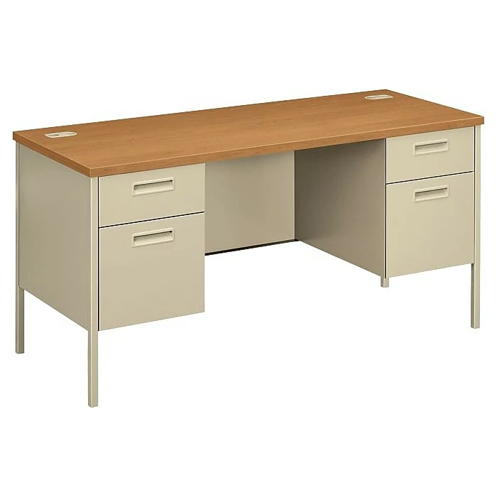 - Harvest finished melamine laminate top for superior durability, Putty painted monochromatic legs, flush end panels and drawer pulls