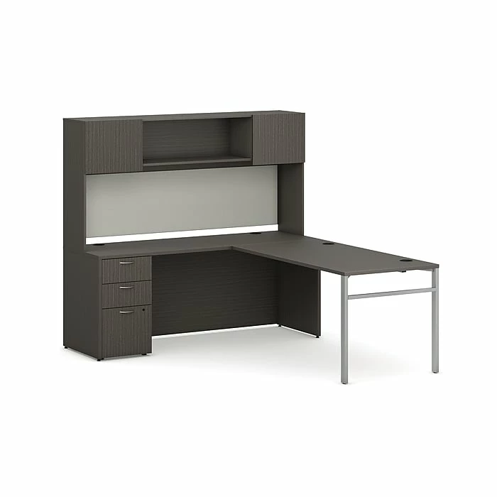 There is always beauty in simplicity, but with the Mod desk collection, you’ll also find variety and value. This executive workstation with storage includes a desk with hutch, support pedestal, and credenza for additional storage. The two box drawers are perfect for stashing office supplies, and the file drawer organizes paperwork. The durable laminate surface is available in a variety of attractive finish options, which allows you to match other Mod elements. It’s totally productive. Totally adaptable. Totally Mod. Laminate finish is slate teak, the tackboard fabric is cool neutral, and the U-leg color is silver.