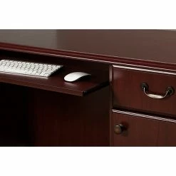 Add a sense of timeless style and tradition to your home or workspace with the Bennington Credenza from kathy ireland® Home by Bush Furniture. Available in a rich Harvest Cherry finish, this product features a generously sized work surface constructed of thermally fused laminate for incredible durability. The convenient, wide pull-out keyboard shelf frees up valuable work surface space. The double pedestal design includes two box files for general supplies and two concealed storage compartments with an adjustable/removable shelf inside. Built to last, meets ANSI BIFMA furniture standards for safety and performance backed by a 6 year warranty. See the full collection for coordinating furniture pieces for a total office solution.