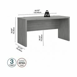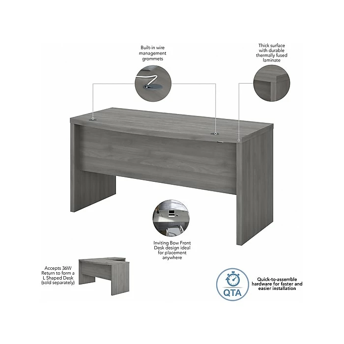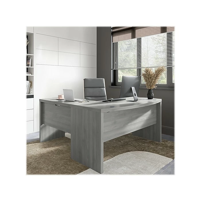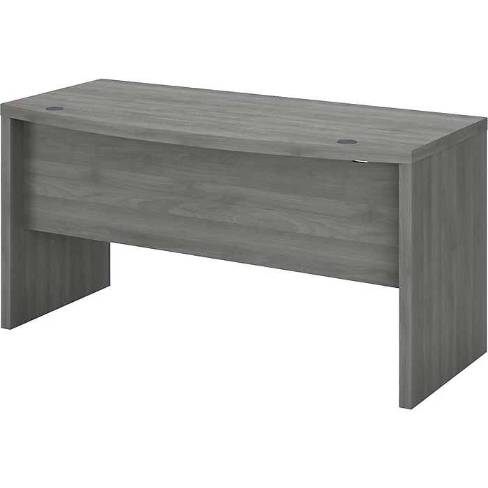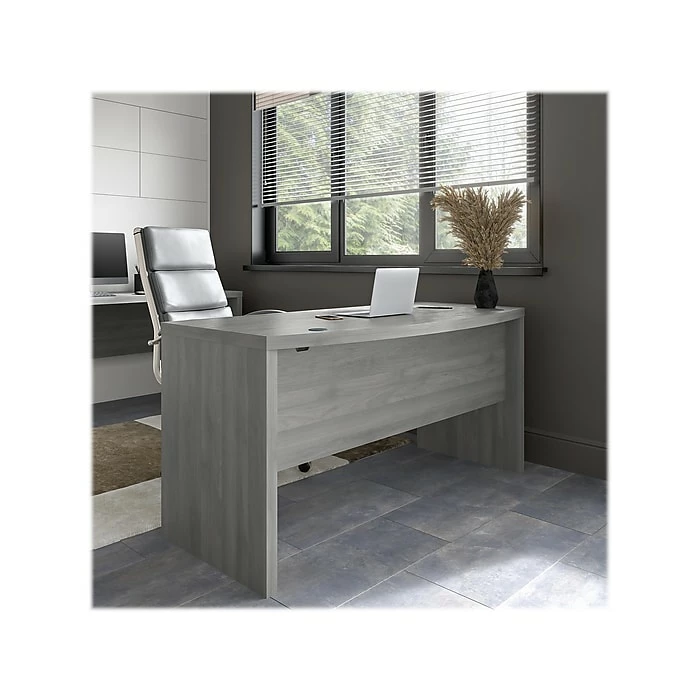 The Office by kathy ireland® Echo bow front desk creates a strong presence perfect for those whose passion for business is only matched by their fashionable tastes. By blending an elegant finish with appealing wide lines, the contemporary office desk inspires and gives a comfortable residential feel to the modern workspace. Thick and durable, a thermally fused laminate surface endures years of everyday use to maintain the desk’s sophisticated appearance. The bow front design impresses while encouraging placement in the middle of an office or room. Combine with a coordinating 36″W return to form an L-shaped desk, and add the credenza for a U-shaped configuration for larger environments (both sold separately). The 60″W desk comes with a 3-year manufacturer warranty and meets the ANSI/BIFMA quality standards for safety and performance.