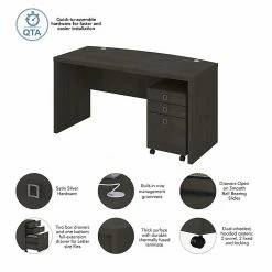 The Office by kathy ireland® Echo bow front desk with mobile file cabinet creates a strong presence perfect for those whose passion for business is only matched by their fashionable tastes. An attractive finish and appealing wide lines give a residential feel to the modern workspace. The thick thermally fused laminate surface endures years of use to maintain the office desk’s elegant style. The bow front design encourages placement in the middle of a room and offers an extended surface for guests to pull up a chair and collaborate. Organization is made easy with the mobile file cabinet, which provides two box drawers for supplies and a file drawer that opens on full-extension ball bearing slides for an easy reach to letter-size documents. Echo comes with a 3-year manufacturer warranty and meets the ANSI/BIFMA standards for safety and performance.