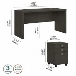 - Modern-style desk is made of engineered wood in charcoal maple