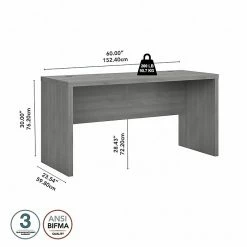 A standalone workspace or the start of something bigger, the Office by kathy ireland® Echo credenza desk offers an elegant, functional design to inspire today’s professional. Wide lines and thick surface create a strong presence, while a thermally fused laminate finish protects the office desk throughout years of daily use. Spread out on the spacious 60″W desktop with your computer, paperwork, or any other tasks of the day. Place the credenza in a corner to save floor space in compact areas, or make use of the finished back to take a prominent position in the middle of the room. Combine with an Office by kathy ireland® Echo 36″W return to form an L-shaped configuration, and add a 60″W bow front desk to form a U-shaped layout for larger environments (both sold separately). This desk comes with a 3-year manufacturer warranty and meets ANSI/BIFMA quality standards.