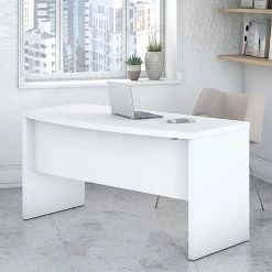 A standalone workspace or the start of something bigger, the Office by kathy ireland® Echo credenza desk offers an elegant, functional design to inspire today’s professional. Wide lines and thick surface create a strong presence, while a thermally fused laminate finish protects the office desk throughout years of daily use. Spread out on the spacious 60″W desktop with your computer, paperwork, or any other tasks of the day. Place the credenza in a corner to save floor space in compact areas, or make use of the finished back to take a prominent position in the middle of the room. Combine with an Office by kathy ireland® Echo 36″W return to form an L-shaped configuration, and add a 60″W bow front desk to form a U-shaped layout for larger environments (both sold separately). This desk comes with a 3-year manufacturer warranty and meets ANSI/BIFMA quality standards.