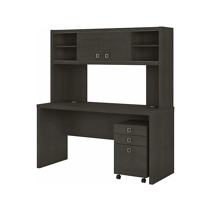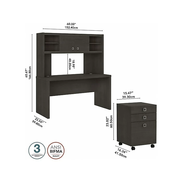 - Bundle includes: 60″W credenza desk, 60″W hutch, three-drawer mobile file cabinet