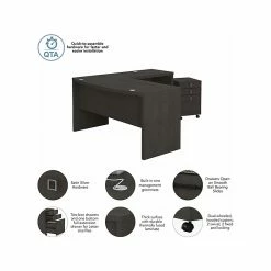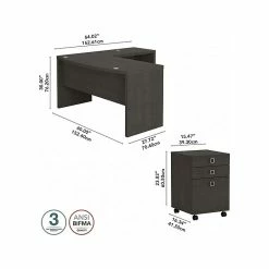- Bundle includes: 60″W bow front desk, 36″W return, three-drawer mobile file cabinet