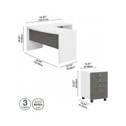 - Bundle includes: 60″W bow front desk, 36″W return, three-drawer mobile file cabinet