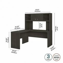 The Office by kathy ireland® Echo L-shaped desk with hutch offers an elegant, functional design to inspire today’s professional. Wide lines and a thick surface create a strong presence, while a thermally fused laminate finish protects the corner desk throughout years of everyday use. Spread out on the spacious L-shaped desktop with your computer, paperwork, or any other tasks of the day. Attach the 36″W return to either side of the 60″W desk to form a left- or right-handed layout. Adding the coordinating 60″W hutch makes organizing your workspace simple. Each outer compartment in the hutch contains an adjustable shelf, and sliding doors offer flexible placement in the center or on the ends for concealing work materials or displaying decorative accents. Echo comes with a 3-year manufacturer warranty and meets the ANSI/BIFMA quality standards.