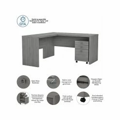 The Office by kathy ireland® Echo L-shaped desk with mobile file cabinet offers an elegant, functional design to inspire today’s professional. Wide lines and a thick surface create a strong presence, while the thermally fused laminate finish protects the office desk throughout years of use. Spread out on the spacious L-shaped desktop with your computer, paperwork, or any other tasks of the day. Attach the return to either side of the desk to form a left- or right-handed layout. Organization is made easy with the mobile file cabinet, which provides two box drawers to store office supplies and a file drawer that opens on full-extension ball bearing slides for an easy reach to letter-size documents. The file cabinet rolls effortlessly on dual-wheel casters. From Office by kathy ireland®, the bundle comes with a 3-year warranty and meets the ANSI/BIFMA standards.