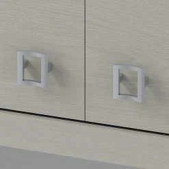 - Your choice of Pure White or Gray Sand finishes and Satin Silver hardware create a contemporary charm