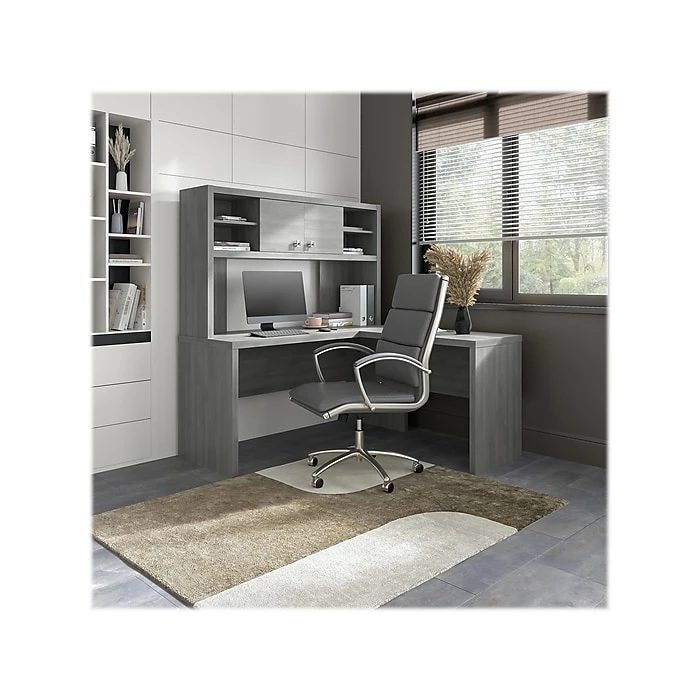- L-shaped desk with hutch offers an elegant, functional design to inspire today’s professional