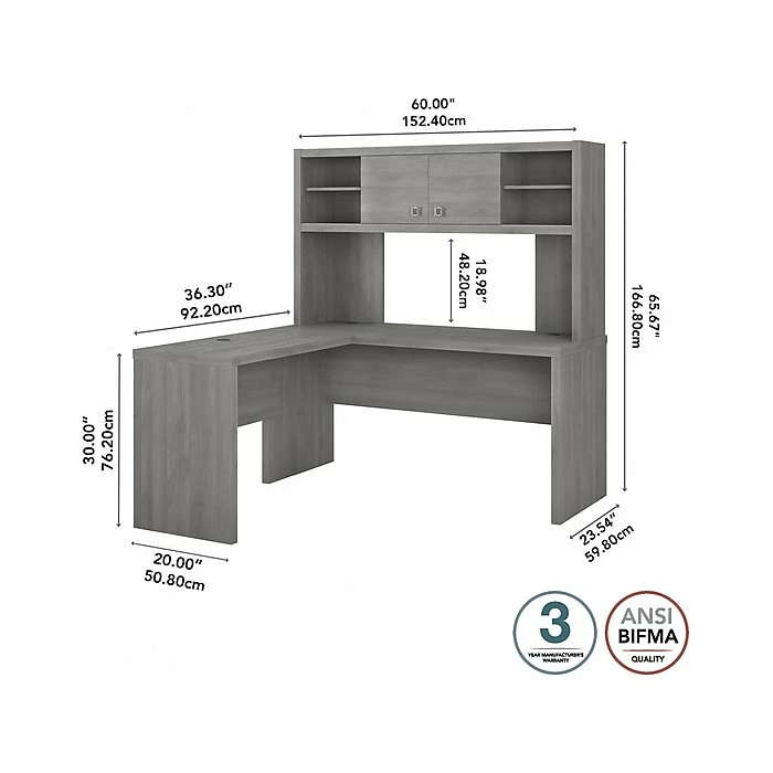 - Bundle includes: 60″W credenza desk, 36″W return, 60″W hutch
