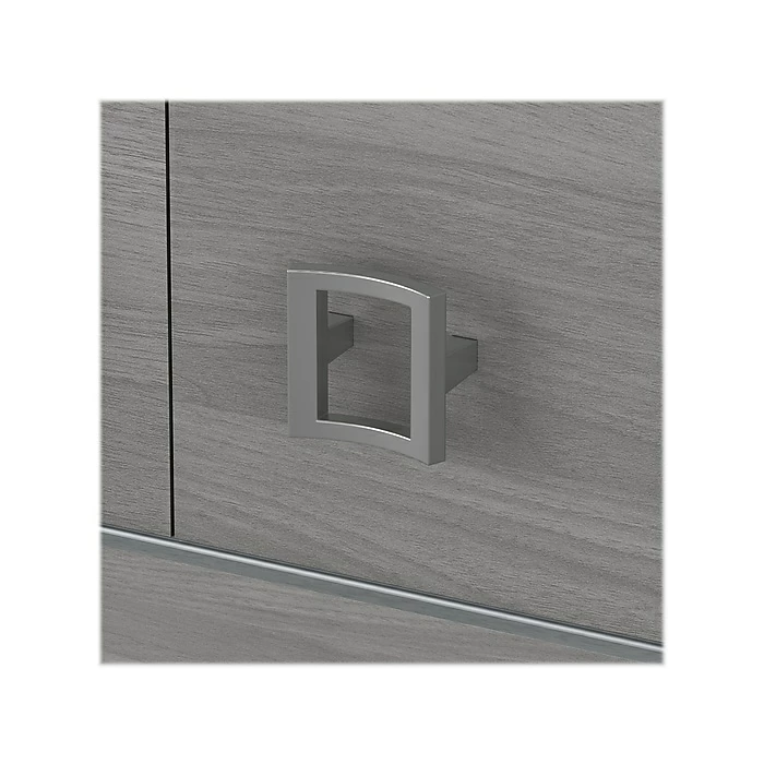 The Office by kathy ireland® Echo L-shaped desk with hutch offers an elegant, functional design to inspire today’s professional. Wide lines and a thick surface create a strong presence, while a thermally fused laminate finish protects the corner desk throughout years of everyday use. Spread out on the spacious L-shaped desktop with your computer, paperwork, or any other tasks of the day. Attach the 36″W return to either side of the 60″W desk to form a left- or right-handed layout. Adding the coordinating 60″W hutch makes organizing your workspace simple. Each outer compartment in the hutch contains an adjustable shelf, and sliding doors offer flexible placement in the center or on the ends for concealing work materials or displaying decorative accents. Echo comes with a 3-year manufacturer warranty and meets the ANSI/BIFMA quality standards.