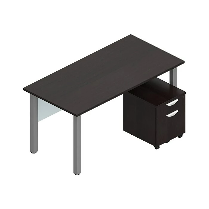 The rectangular desk design provides plenty of desktop space. This Offices to go desk comes in the American espresso color and is made of laminate. The mobile pedestal features two drawers. The base is made of metal for durability and strength.