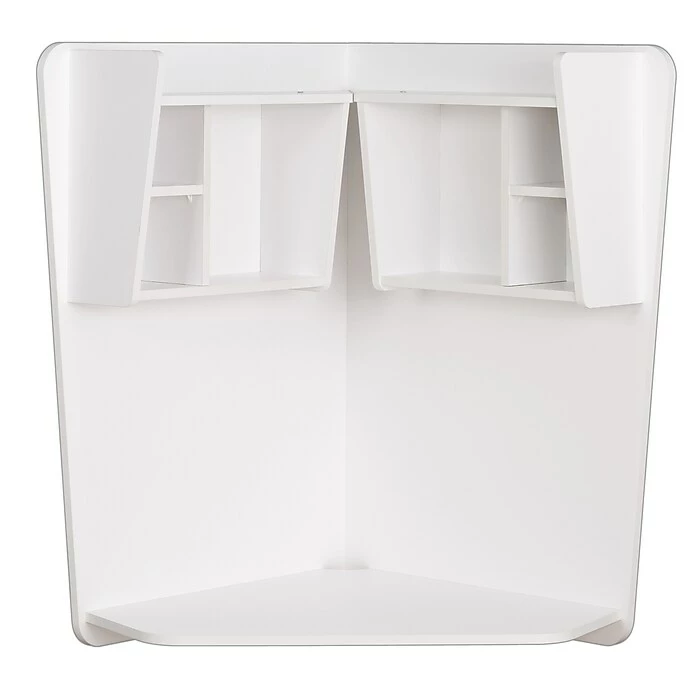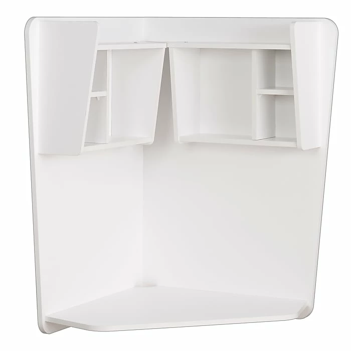 Convert any corner in your home into a mini office with the Prepac Floating Corner Desk. Cleverly designed to make assembly and installation a breeze, this desk features a large work surface for your computer and a cutout for cord management. Use the 7 top shelves for storing books, stationary and supplies.