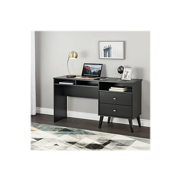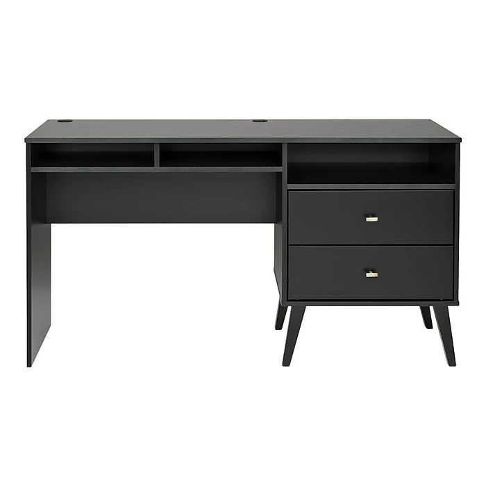 With a sleek mid-century modern design, the Milo desk adds a touch of vintage to your home office. A large 55″ x 18″ desktop provides room for a computer as well as other workspace necessities. The two medium-sized compartments are perfect for notebooks and supplies, while the 21″ wide compartment above the drawers makes a great place to stash away your laptop or other devices. There are two covered circular grommets for wire management, and the privacy panel is positioned slightly forward to allow access to electrical outlets. The two drawers run smoothly on metal glides with safety stops and provide ample storage to keep your workstation tidy. The tapered solid wood legs and brushed brass finished knobs deliver a clean and modern look and make this sturdy desk the perfect complement to the Milo bedroom collection. The desk is constructed from durable, nontoxic, CARB2 compliant laminated composite wood.