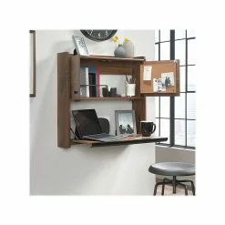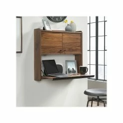 Limited space is an issue of the past. Create a convenient spot to check e-mails and work on projects without taking up a huge amount of space in your home with this wall desk from the Harvey Park collection. This one-of-a-kind wall desk features a space-saving hanging design that offers versatile placement throughout any room in your home, whether in the living room, the kitchen, or even your bedroom. It’s large lower door flips down to create a spacious work surface that can accommodate your laptop, stacks of notepads, your favorite coffee mug, and a little home decor too. The two top doors swing open to reveal a handy storage area that includes a spot to stow away your folders and envelopes along with a tackboard to post important notes and reminders. This wall desk also includes cord management pass-through holes so you can keep all your wires neat and out of the way. Finished in Grand Walnut, this unique work desk is the small space solution for you.