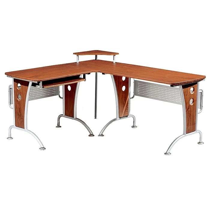 Get work done efficiently with this L-shaped computer desk. The MDF panels are constructed from heavy-duty material and feature a PVC laminate veneer finish, protecting against moisture, scrapes, and other wear. With an interchangeable design, this workstation offers enhanced versatility and makes it easy to accommodate various room shapes. This Techni Mobili deluxe computer desk has a raised shelf for additional storage options and has a retractable keyboard tray, saving desktop space and providing a clean appearance.