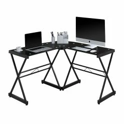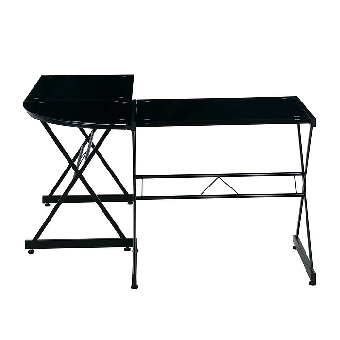 If you are in need of a larger workspace in your office or home, check out the Techni Mobili L-shaped Black Glass Computer Desk. It has black tempered glass top and a cross frame design that provides a modern appeal. It has a black powder-coated frame and floor glides. The design of this black L-shaped glass desk is sure to complement a variety of decors. Color: Black