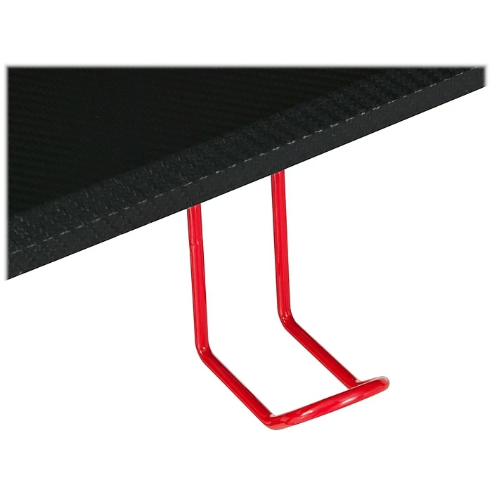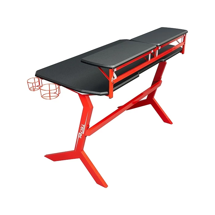 Techni Sport gaming desk provides customization to fit your gaming setup in style and features carbon-fiber like laminate surface desktop, scratch-resistant finished steel frame with two adjustable and removable monitor shelves.
