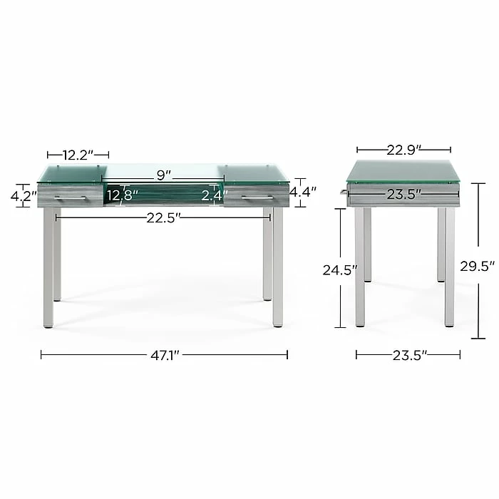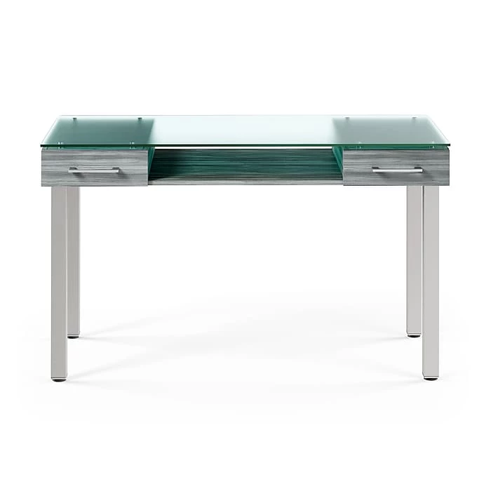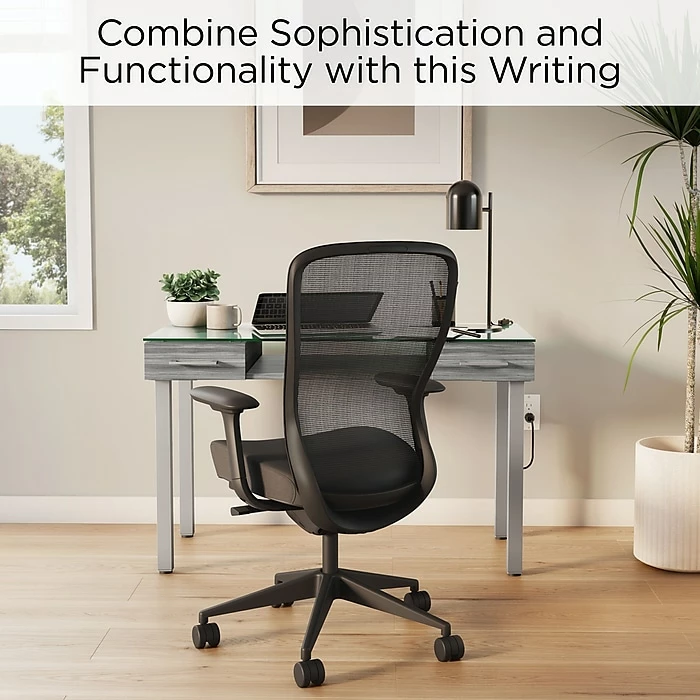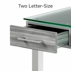 Combine sophistication and functionality when you add this desk to your office. The gleaming frosted glass desktop delivers a modern look and a smooth writing surface, while the two letter-size drawers provide discreet storage for office supplies and paperwork. A thoughtful open design underneath provides space for additional desk components to create a custom setup. This Union & Scaleâ„¢ Prestige desk boasts a neutral color scheme to coordinate with your existing office decor and features metal legs for added strength and stability.